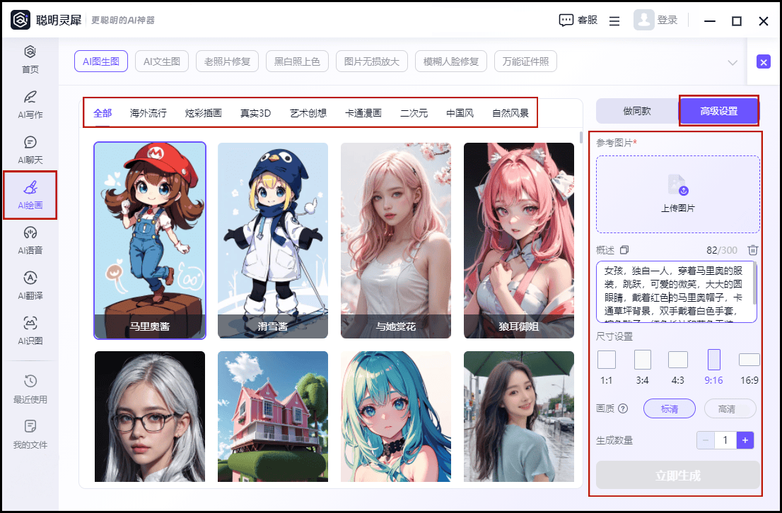 也一样供给了分歧的气概选择,综上哪些好用的AI绘画生成软件?所述,别离是AI图生图和AI文生图。看看它们若何以奇特的魅力,平台内供给了丰硕的东西和功能,用户可选择炫彩插画、漫画和中国风等多种分歧气概的艺术做品模板,都表示出了杰出的机能。